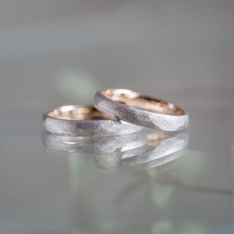 一生つける物ということもありシンプルかつ長く愛用できるデザインが良いと思い、若干のウェーブに一部分にマット加工を施しています。ウェーブしていることで色んな方向から違った角度で指輪を楽しむことができます。またマット加工を入れたことで自分から見たリングと相手から見たリングで違った見え方をするので、とても付けていて面白いリングになっています。