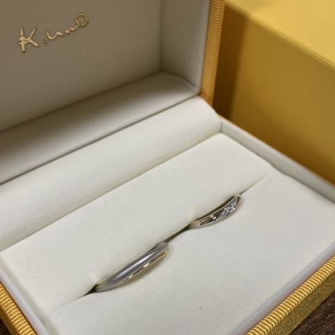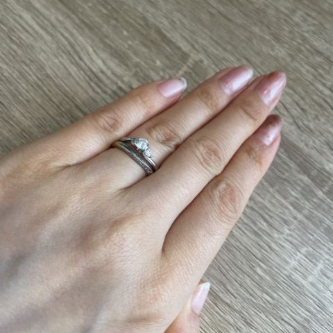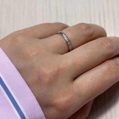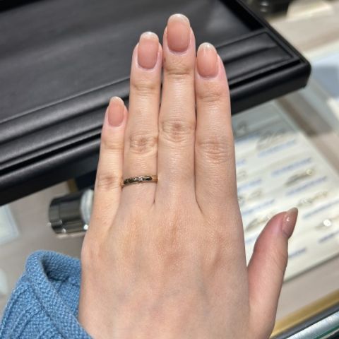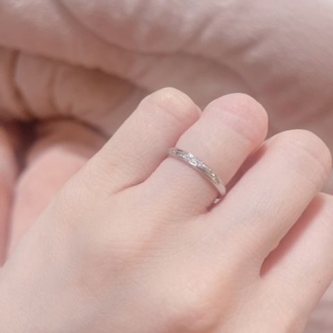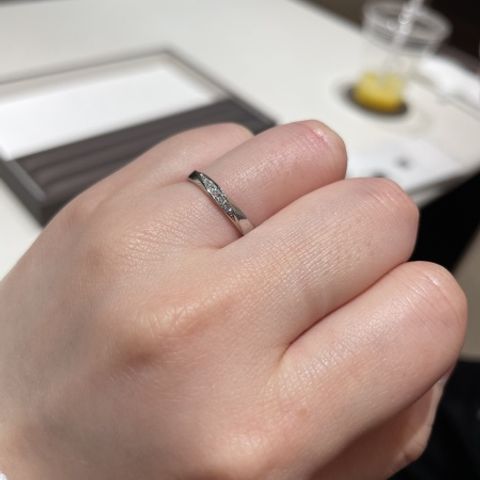来店する前からいいなと思っていた指輪を、実際に着用させていただきました。他のデザインも見せていただきましたが、あまり悩まず今回のデザインに決まりました。ダイヤが斜めに入っているので特別感もありつつ、ギラギラしすぎないので普段使いもできそうで気に入っています。