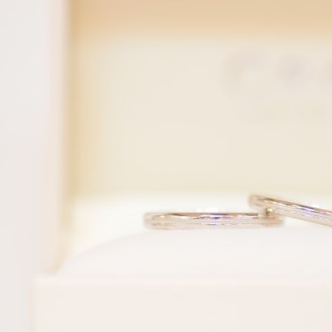 いろんな指輪を見て、試着して、考えて決めました。他にないデザインでした。女性側だけでなく男性側もデザイン性がありよかったです。既製品にしても自分のわがままを叶えられるので価格も抑えられました。重ね付けも考えてこちらに決めました。