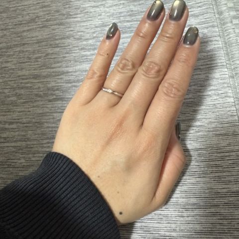 指輪を選ぶ時に、色はゴールドが良いと決めていました。ゴールドで一粒のダイアモンドが埋まっており、とても私の理想に近かったです。ゴールドにも二種類あり、私は上品さのあるシャンパンゴールドを選びました。オーバルリングヘアラインは一方向に髪の毛のようなラインが薄く入っているのですが、サティーンは多方向なので私はそのデザインが好みでした。