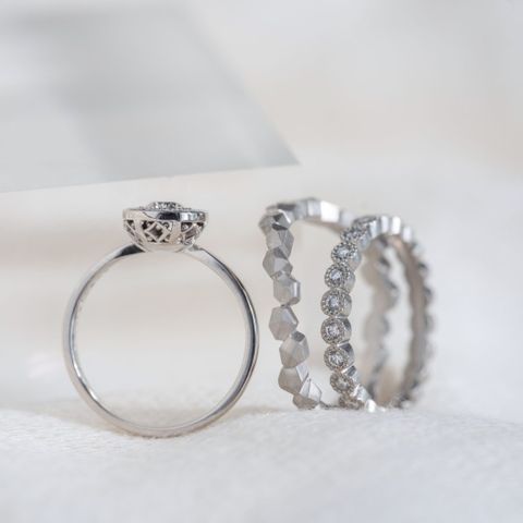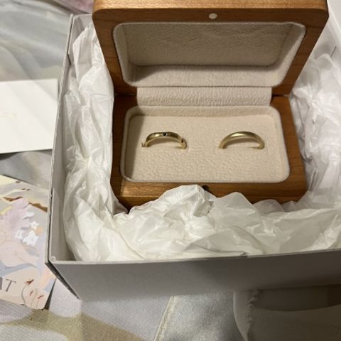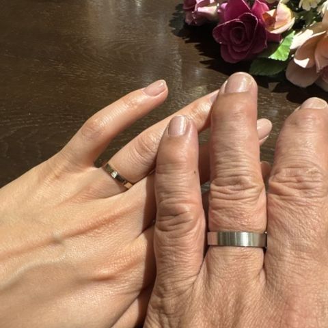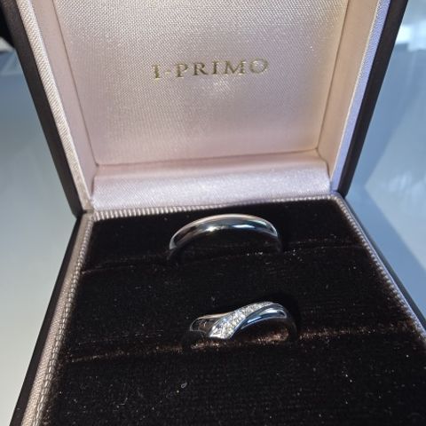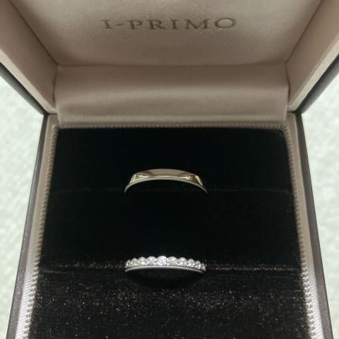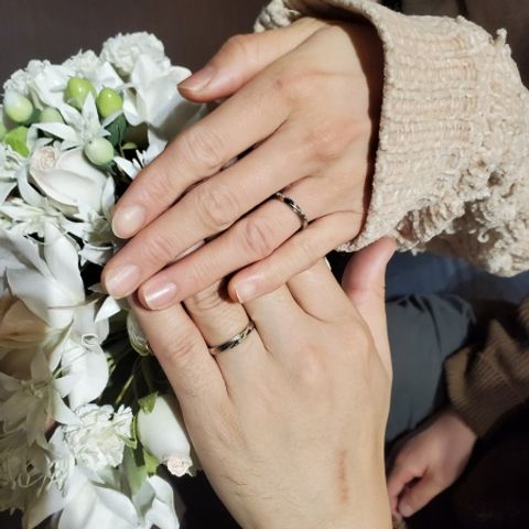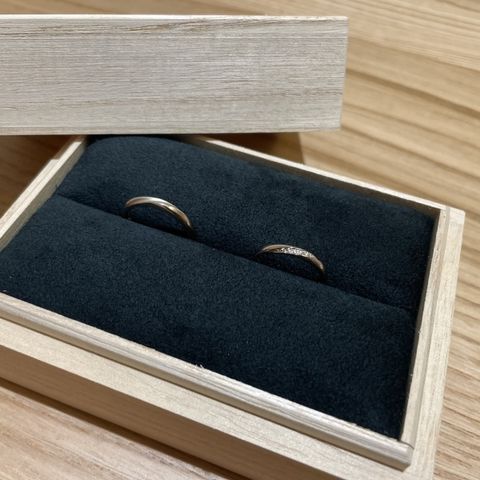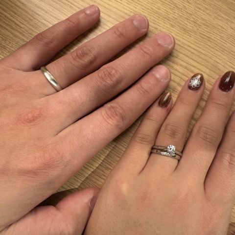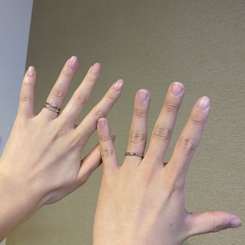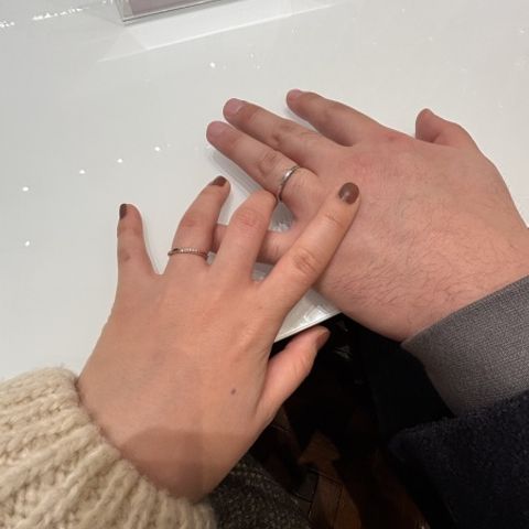 2人ともこだわりがあり、セットではなく、お互いが気にいるものを選びました。男性側は太めでしっかりとしたリング、女性側は華奢でキラキラとしたリングです。女性側のリングはいただいた婚約指輪(別ブランド)のものと重ね付けをしても綺麗にみえるものを選びました。