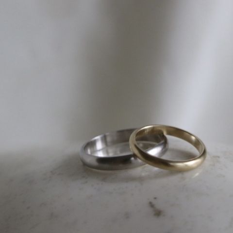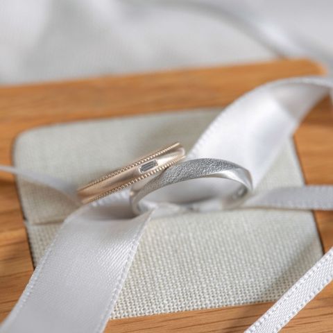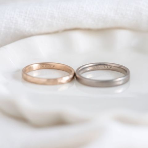 ベースとなるデザインがいくつかあり、そこから素材やリング幅、テクスチャーなどを組み合わせることでオリジナリティのある指輪ができました。 非常にシンプルなのですが、レディースは半面だけ槌目を入れテクスチャーを変えていただき、フォーマルでもカジュアルでもどちらの場面でも楽しめるようなデザインにしていただきました。