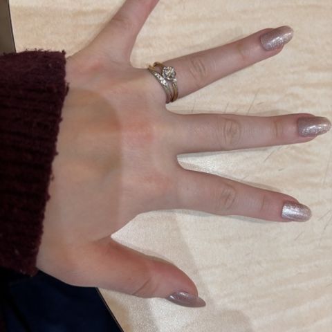 婚約指輪と重ねづけしたかったのですが、まさにぴったり合うデザインの指輪を見つけて心躍りました。メレダイヤが半周ぐるりと並べられていて、一見派手かな?と思いましたが、つけてみると意外に上品です。真ん中がきゅっとなっているデザインが指を綺麗に見せてくれる気がします。