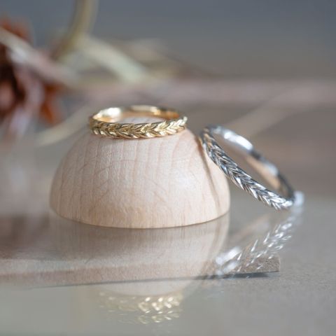 リーフのデザインとても素敵で、人と被らないリングでとても気に入っています。それぞれ肌に合ったゴールドとプラチナで作成してもらい、どちらもかなり良いです。 リングの太さを太めにするか細めにするか悩みましたが、細めにした事で、長年つけ続けられる指輪になりました。