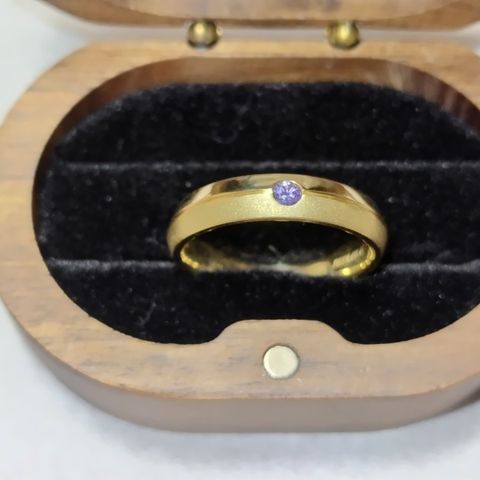 斜めのヘアラインが好みです。お互いの似合うデザインや好きなデザインが合わなかったため、それぞれの好きを尊重しながら素敵な指輪になるようにしました。内側の刻印にも名前と名前の間におそろいの石をいれることができて、自分たちだけがわかるポイントが気に入っています。