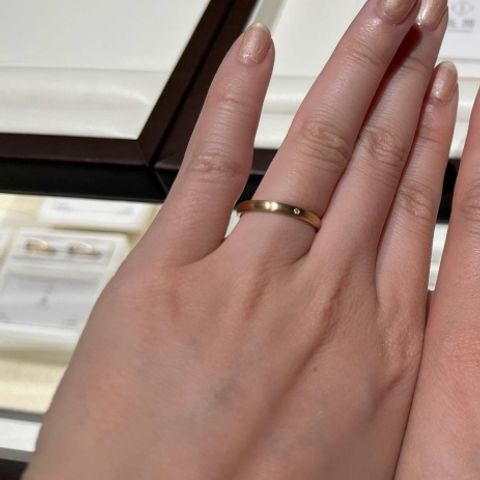 シンプルで少し華やかさがあるのがポイント! 普段の指輪とは違う特別感がでて良いと思いました。 太すぎないデザインがよかったので丁度よい細さです。 ダイヤが入っていて派手かなとも思うが、意外にピンクゴールドなのでそこまで気にならない!