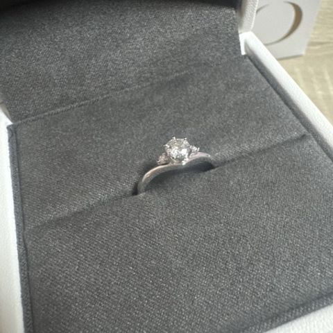 シンプルで長く使えるデザインを探していたので、この指輪に決めました。 シャープなデザインでかわいくなりすぎず、接客業の私は人の目につくような派手なダイヤモンドのついた指輪はNGですので、程よく高級感のでる上質なダイヤモンドが少しついたこのデザインがぴったりでした。