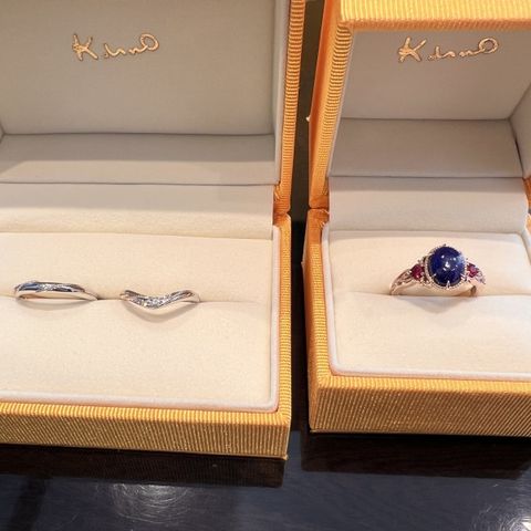 ラピスラズリ、ルビー、ダイヤを使うこと、普段使っているネックレスと親和性があること、婚約指輪と結婚指輪を重ね付けできることの3つが条件でした。 条件達成はもちろん、予想以上に素敵に仕上げていただき大満足です。 今まで指輪を着ける習慣がありませんでしたが、ずっと着けていても全く違和感ないです。 一生大事にします。