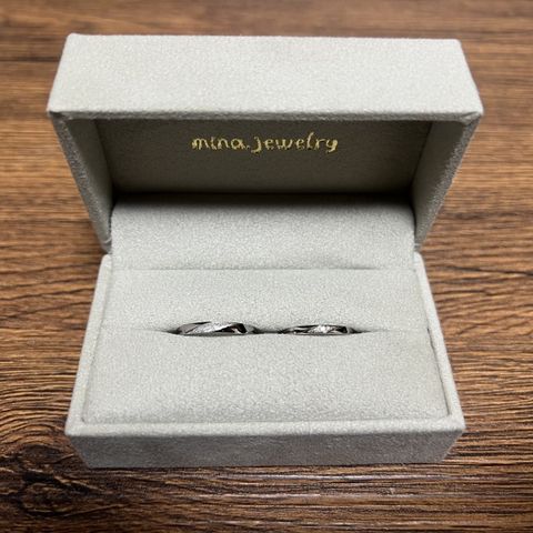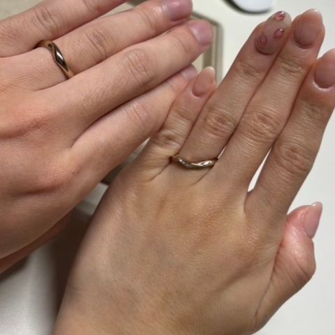シンプルなウェーブタイプのリングで、2人で同じ色にするか迷ったけど、実物を付けて比べて自分たちに似合う色を時間をかけて決めることができた。色んなオプションがあって、お互い少しずつデザインを変えて作ることができた。