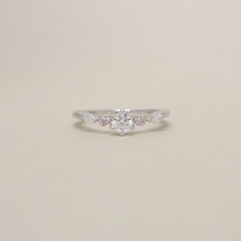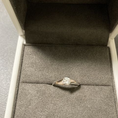 デザインがかわいいです。真ん中の大きいダイヤの横には石が散りばめられててキラキラしています。ダイヤを固定する部分も挟まれている埋込みタイプで引っかかりを心配することがないのもおすすめポイントです。リングの色もピンクゴールドとシルバーを掛け合わせるものでそこもかわいいです!