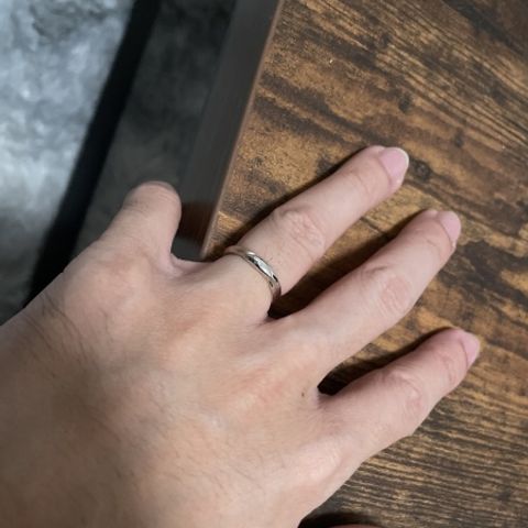 シンプルなデザインなのでシーンを選ばず着用できます。 よく見ないとわからないかもしれませんが、表面はヘアライン加工の鎚目で、おしゃれな感じです! パートナーが鎚目のデザインを希望していたので、数ある中から選びました!
