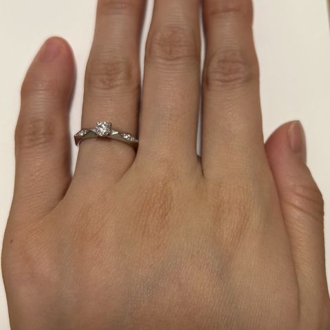 9つのダイヤが埋め込まれており、存在感あり、どこから見ても美しいです。側面から見た美しさは特に他にはなく気に入っています。シンプルなデザインなので上品で飽き無いと思います。指も美しく魅せてくれます。本当に購入してよかったです。
