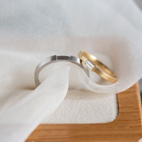 私がアレルギー体質なので安全さを求めて素材はプラチナと決めていました。 ペア感があって何より着け心地が良い。色んな指輪を付けて検討しましたが最終的に選んだ指輪に戻ってきました! デザインも綺麗でお気に入りです。 男性用は中央部分の素材がセミオーダーで選べます。見本は中央部分がゴールドでしたがツヤなしプラチナへ変更しました。