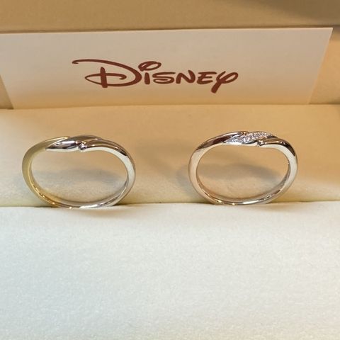 女性の指輪は金とプラチナがそれぞれ入ったものを選びました。シンプルではありますが中央のダイヤがアクセントとなりとても綺麗なシルエットになっています。この指輪はアラジンとジャスミンをモチーフにした指輪で中にアラジンにちなんだ刻印も入れて貰えます。