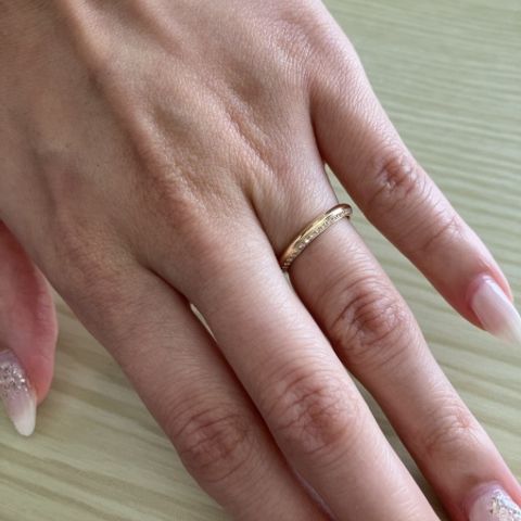 普段アクセサリーをつけないので、多少華やかさが欲しいと思っていましたが、派手すぎるデザインが苦手で、そういった相談をして、さりげなくサイドにダイヤをつけたデザインにしてさりげなくダイヤが光って綺麗です。