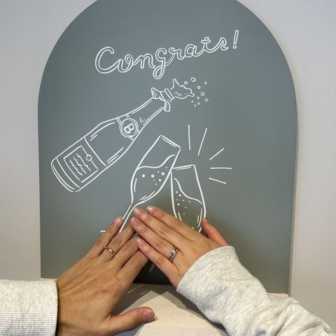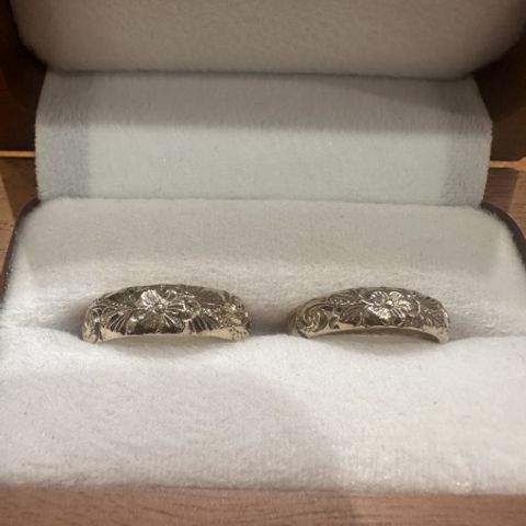シルバーにきらめきのあるマットをあしらっていただきました。肌の色に合ったシルバーを選んでいただき、肌の色合いともなじみも抜群で自分で言うのも何ですが似合っている指輪ができて大変気に入っています。内側には2人の名前と入籍日に加えて、2人の好きな猫の絵文字も入れてもらって特別感を出していただき嬉しいです。