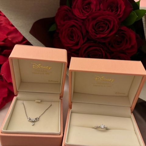 わたしがゴールド、彼はシルバーが似合うので、二色が入っているコンビのリングを探していました。初めは「デザインはシンプルなもの」を中心に試着させていただいていましたが、ダイヤがたくさん入っているデザインがキラキラして非常に綺麗で、このリングに決めました。彼のリングもわたしと同じデザインで9つのダイヤが入っているのがおすすめポイントです。