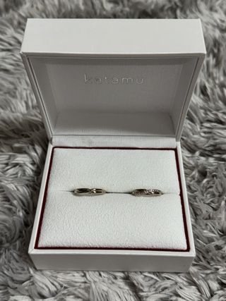 祈結(いのり)というしめ縄のようにねじれたデザインの指輪です。見た目の可愛さと「縁を結ぶ、契を結ぶ」という意味が込められているところに惹かれました。旦那さんもわたしももともとシルバーアクセサリーが好きなのでプラチナの素材を選び、ホーニングという加工を施してもらい素敵なものができました。