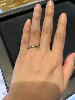 色々なお店を探していたけど誰も夫婦揃ってこれだ!ってなる指輪がなかった時に、たまたま見かけたこの指輪が唯一2人の意見があったのでこちらに決めました。旦那はゴールドの指輪が良かったけどなかなかゴールドの品揃えがいい店なくてこちらはたくさんあったので良かったです。