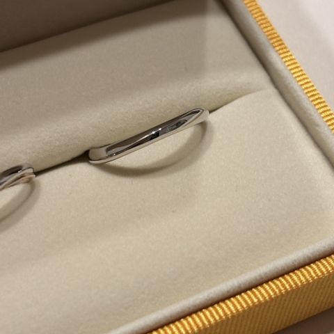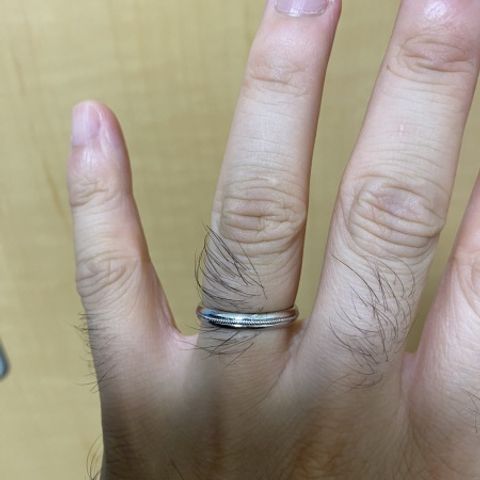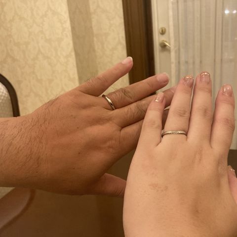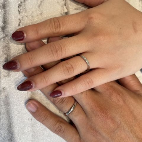 全く同じデザインではなく、私と夫で色味と加工が違うものを選択しました。全く同じじゃないと結婚指輪っぽくならないのではないかと心配していましたが、お店の方がそれぞれ少し違いがある指輪をつけている夫婦もよくいらっしゃると教えてくれたので、それぞれ自分の好きなデザインを選ぶことが出来ました。夫がデザインにこだわりがあり、事細かに希望を伝えていたのですが、真摯に聞いてくださり、出来るだけ自分たちが納得できるように寄り添ってくれたおかげで、素敵なデザインの指輪になりました。