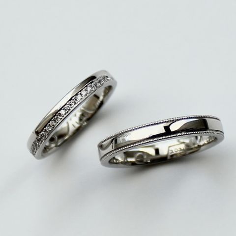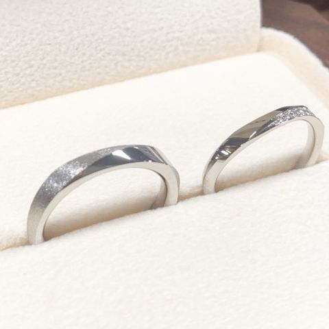 素材…プラチナ 新郎…ストレート、鏡面と粗目マット加工、面取り加工 新婦…S字、ダイヤ、鏡面、一部スターダスト加工、ヘアライン加工、面取り加工 新郎は、指のごつさに埋もれない幅と厚みを持たせました。フルオーダーだからできた大きなポイントです。 新婦は、指が細く綺麗に見えることとをテーマにデザインを進めました。面取り加工したおかげでシャープな印象になり良かったです。 付け外しすることを考え、上下正面裏どうつけても違和感のないよう一周にデザイン加工を施しました。 当初ペア感は考えずそれぞれが気に入るよう進めましたが、結果としてベースのデザインや加工でペア感が出ました。