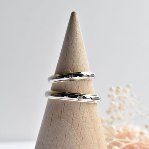 妻は婚約指輪と重ね付けもできて、単体でつけていてもエタニティリングを重ね付けしてるように見える。年をとっても付けられるデザインにしました。 夫は他のブランドで気に入ったデザイン風に手作りで。 内側の刻印も私たちらしい想いをたくさん込めました。