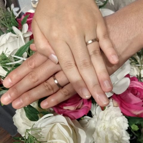 2人で話し合ってお互いに似合う指輪を選びました。 女性側はシンプルでかわいいし、男性側はシンプルではあるけど、マットな感じにして頂いて、かっこいい感じに セットで見てもシンプルでとてもかわいいデザインです!