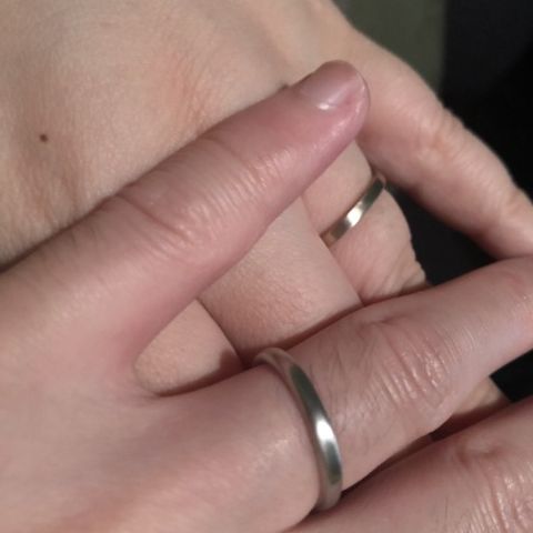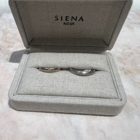 私は2mm幅のプラチナの甲丸で彼は2mm幅のプラチナの平打で作成しました。 2人共クリアとマットのハーフで作成しました。 半分でデザインが変わるので気分によって変えられるのでオススメです。 内側にはイニシャルと日付を刻印してもらいました。