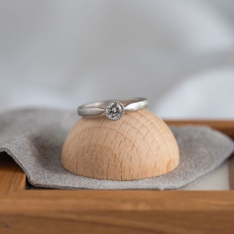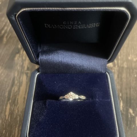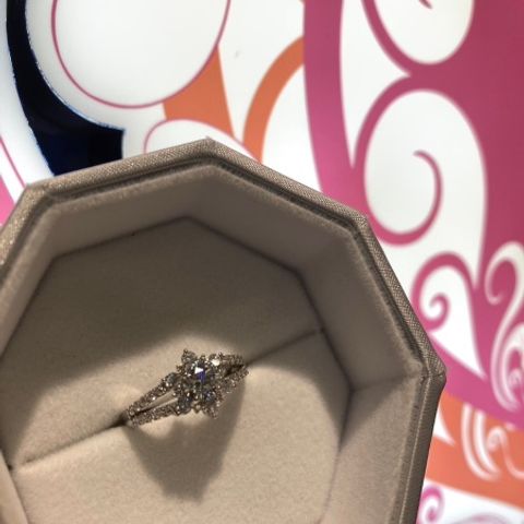 憧れていたクッションカットに周りもダイヤモンドで囲ったスタイルです。色々と相談に乗っていただき、思い通りの形が再現できて感動しました。仕事の時以外はほぼ毎日つけるほどお気に入りです。とにかく華やかでよく褒められます。