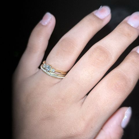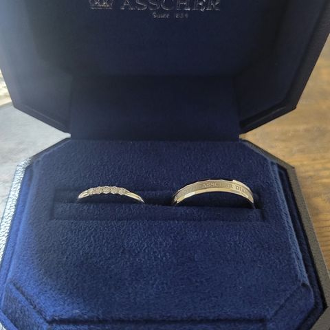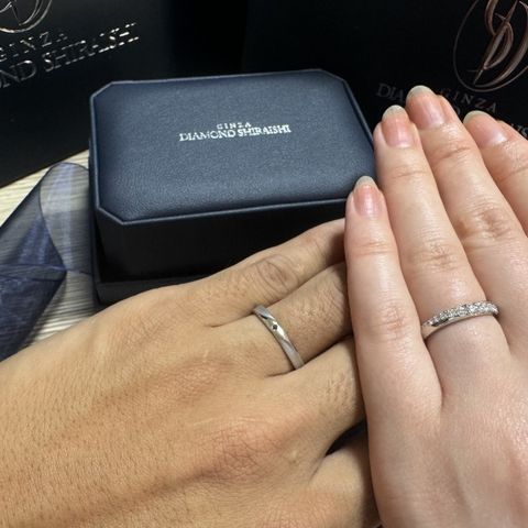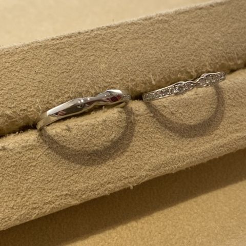 女性用リング、とっても気に入っています♪幾つもリングを見せていただき妥協のない1番気に入ったものにしました。着けて自分から見てもダイヤの輝きがとてもわかる上にダイヤがサイドにまでしっかり埋め込まれているためどの方向から見てもダイヤが輝いているのが素敵です!ダイヤの大きさも少しずつ違い、また着け心地も最高。サイズ感も思っていたよりとても小さいサイズを勧めてくださって少し不安でしたがぴったりでした!仕事で水を沢山使うので汚れてしまわないか心配ですが着けて出かけるのが楽しみです♪ 男性用リングも彼、私ともにとても気に入っています!サイドに少しくもりを入れてもらい自然にフェードアウトしていてセンターにブラックダイヤモンドがキラッと。最高なデザインに2人で毎日着けた指輪を見せ合いっこして楽しんでいます♪