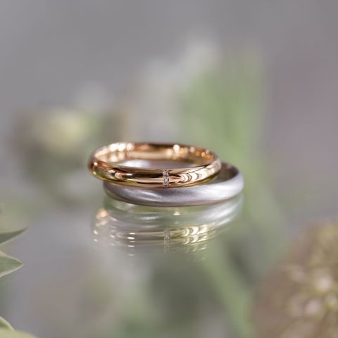 コンビネーションデザインを探して、他にはない唯一無二のデザインに惹かれました。私がプラチナ×ピンクゴールド、彼がプラチナ×イエローゴールドに決めました。2種類の素材が入り組んでいてとっても個性的で素敵です!
