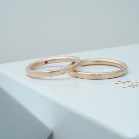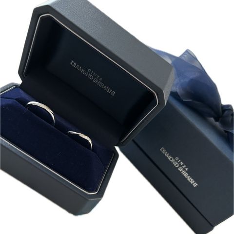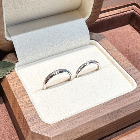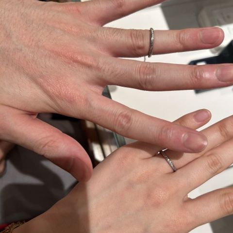 たくさんのお店を巡る中で、 ①2人で満足できる ②お揃い感がある ③着け心地が良い ④高齢になっても飽きが来なさそう を重要視したいとなり、 特に①②から、TANZO.さんにお願いすることにしました。 他ブランドも素敵なものが③④を満たすものは たくさんありましたが、 彼の「新婦が選ぶもののペアにするよ」の言葉に 私は納得できず、お互いに心から満足して購入したいと 思っていましたが、 男性物には特徴があまり無い物が多く、 納得できるものに巡り会えませんでした。 この背景からフルオーダーメイドを選択し、 彼のマット加工やライン・槌目の希望を折り込み、 私は指輪の太さや、ダイヤと無地部分の比率について 1mm単位でこだわり、 納得のいく指輪となりました。