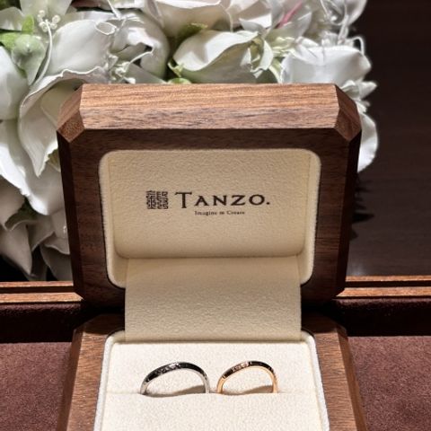 フルオーダーでお互いのこだわりがつめられるところです! 今回はその中でもラインをそろえて、結婚指輪としてペア感がでて、とても大満足の指輪です。 ただ、フルオーダーでどんなデザインになるか不安もありましたが、「入籍指輪」というシステムがあり、指輪のサイズ感や入れるデザインの簡易的なものを入れて頂き、何の2ヶ月程実際につけて試して、結婚指輪のサイズやデザインをきめれるという流れがあって、とても安心して購入でき、また2度楽しみがあり、こちらのTANZOの指輪にしました! 私はキラキラの指輪が好みでダイヤをいれてもらい、彼は表にマット加工を、その真裏に金線をいれて、指輪が回ってしまってもデザインが見えるようにしていて、フルオーダーならではの指輪ができます! 指輪の内側にお互いの誕生石を入れて、見えないけど特別感があってとても素敵!!!