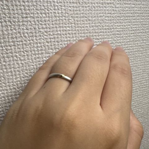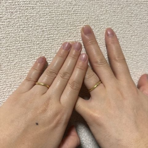 たくさんの色から自分たちに合う色を選びました。 肌馴染みが良く、目立ちすぎないところも気に入っています。ニュアンスリングで、ゆらゆらとしたラインでかわいい印象です。加工の掛け直しなどのメンテナンスは何度でも無料とのことで、また違う加工で指輪を楽しみたいなと思います。