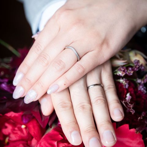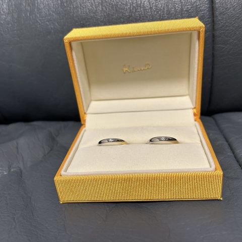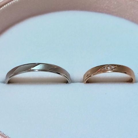 金とプラチナが両方入っていて、飽きのないようなデザインにしました。もともと女性の方にだけダイヤが5つ入っているものでしたが、指輪自体の存在感が強くエレガントすぎて私の普段の服装には合わないのではないかと相談させていただいたところ、ひとつのダイヤを2つに分けて1つずつ入れることができるとおすすめしていただき、夫の指輪にも1つダイヤを入れました。ダイヤは1つなら控えめなので男性の指輪にも入れてもいいなと思いました。 夫の指輪の金の部分に艶消しをかけたのですが、それがとても気に入っているようです。艶消しがあるとキラキラしすぎなくて男らしさを感じることができます。大人っぽい落ち着いた雰囲気も出ておしゃれだと思います。