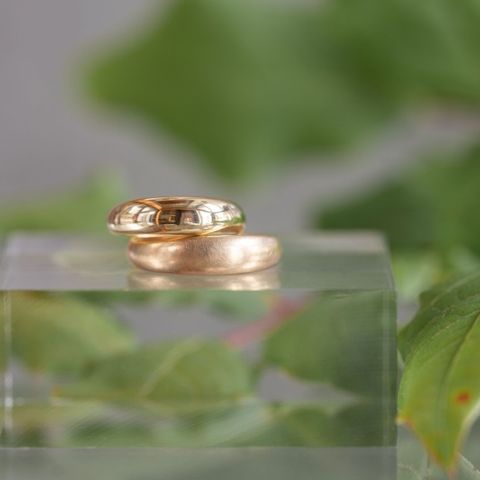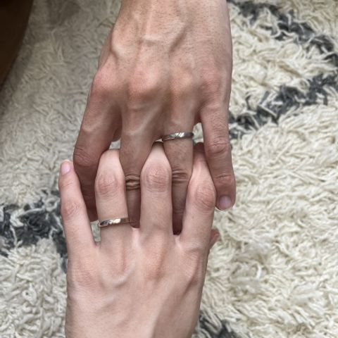 長く着けていくものなのでこだわって、本当に自分が気に入ったものを身に付けたいと思っておりました。 甲にかけてリングの厚みを持たせたこだわりのデザインで作っていただきました。 幅も5mmと太めで個性的な結婚指輪にしていただきました。 素材もテクスチャーもお互い好きなものを選ぶことができ、 本当に気に入ったもの・理想のデザインであることが叶いました。