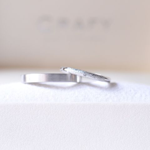 【指輪のデザインについて】 結婚指輪を探して、いろいろなブランドを10件ほど回りました。見ているうちに「プラチナで鍛造製法のストレートが良い」と2人で決めたところまでは良かったのですが、彼の欲しい指輪と私の欲しい指輪のブランドが一致せず...。指輪探しはかなり難航しました。 最終的に、それぞれの好きなデザインで職人の方にフルオーダーか、2人で手作りにしようということになりました。 CRAFYへ相談に行く前からそれぞれ希望のデザインが決まっていたため、相談時もスムーズに進められました。出来ることの幅が広いため、全くこだわりや希望イメージがないと難しかったと思います。 夫のリクエストで夫の指輪の槌目模様を私が打ったり、内側の刻印に新緑の時期の結婚式を表してリーフモチーフを入れたり...いろいろこだわりを詰め込むことが出来ました。 【価格について】 当初の予算の半額で作ることができました。結婚指輪にしては安すぎるかな?と思いましたが、他と違いブランド料がないだけで素材の品質は良いものだったので、お得に買い物が出来ました。 結婚式をすぐ控えていたので、そちらに予算を回せたので結果良かったです。