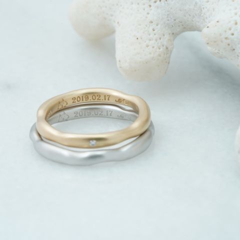 フリージアのデザインをベースに作成していただきました。 ねじれ部分を境に色を変えた2色のリングで、メンズとレディースで色が反対になっています。 また、ねじれ部分以外に鎚目を入れていただき、どの方向から見ても可愛く、色もデザインも2通り楽しめるリバーシブルのようなデザインがとても気に入っています! レディースはダイヤモンド1ピースを星彫りの縁で入れていただき、控えめな煌めきが美しく、つい眺めてしまいます。 指輪の内側には2人とも結婚記念日を手彫りで入れていただきました。温かみがあり、これもまたじっくりと眺めたくなります。