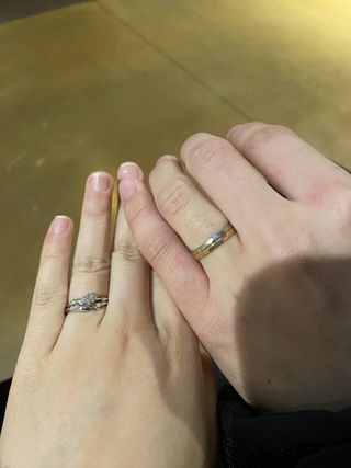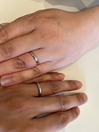 夫婦でデザインが違うものにしましたが、基本的な太さや形は一緒にしました。 デザインは違いますが、お揃い感があって、良かったです。シンプルな指輪を求めて色んなブランドさんを見ましたが、1番しっくりくるオーダーが出来ました。