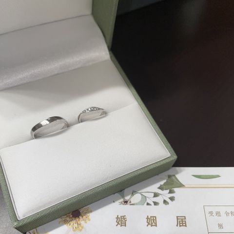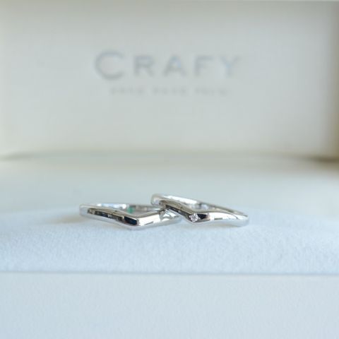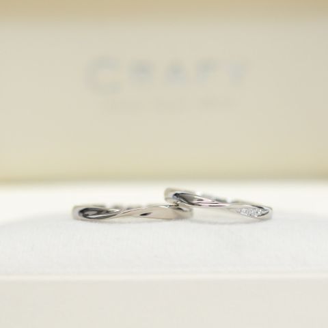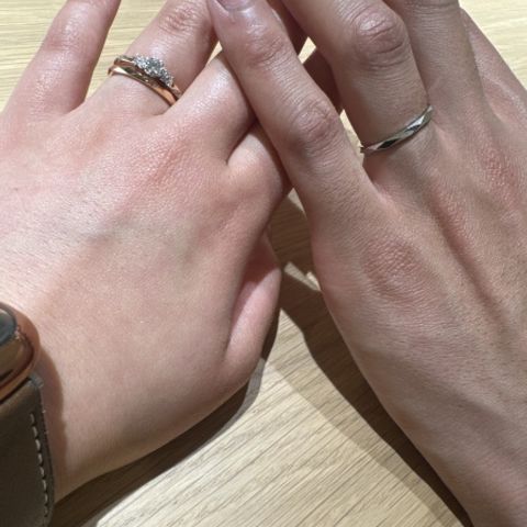 女=プラチナとゴールドの組み合わせが良かった。指が綺麗に見えるデザイン。存在感があり、ダイヤも素晴らしい。 男=シンプルだけどひと癖あって個性的なものが良かった。 ペアの指輪ではなかったが、お互いが気に入ったものを選んだ。ウェーブしている部分が、少し雰囲気似ていて良かった。