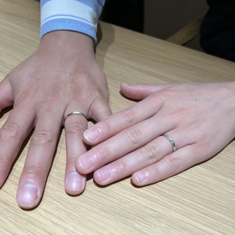 婚約指輪は一粒ダイヤ、結婚指輪はウェーブタイプがいいと思い、セットでも綺麗にはまる2つを組み合わせました。 結婚指輪は、ダイヤがギラギラしすぎず、でも正面からも上からも一部に輝きが見えるというとても綺麗なデザインです。メンズの方は真ん中にマット加工を入れることで少しファッション性も出ておしゃれな指輪です。