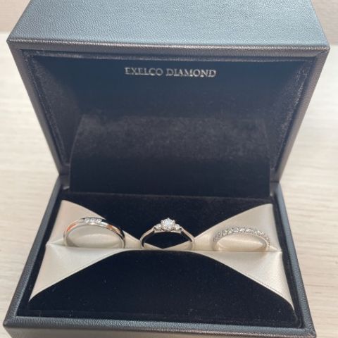 婚約指輪と結婚指輪を二つ付けた時、ひとひねりというデザインが婚約指輪のダイヤモンドにちょうどはまりとっても可愛いくておすすめです♪ 金属の種類も様々あり、旦那の方はブラックゴールドという色でプラチナよりやや暗めの色合いで、アンティークな感じが好きな方なのでぴったりなものが見つかって良かったと思います。