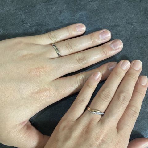 ブラウンゴールドとシルバーとの組み合わせが個性的で、一目惚れしました。ウェーブのデザインも指が綺麗に見えるのでオススメです。男性のリングには真ん中にマットな部分があってシックでとてもかっこいいです。マットの部分がある作りも他にはあまり見ないデザインでした。