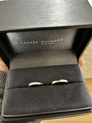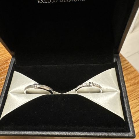 一生に一度の指輪選びで、長くつけていくなかで妥協できないポイントがあり、私はダイヤが長めでキラキラしたデザインを探していて、旦那はシンプルかつ少し変わったデザインがいいとのことで、2人の希望が叶ったこちらの指輪に出会うことができました。