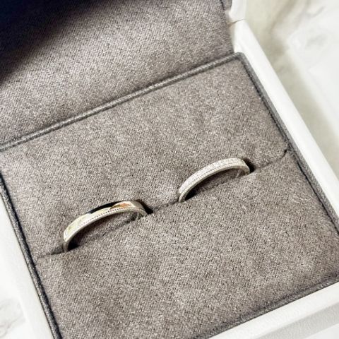 細部までこだわりを詰め込んで作ってくださいました。v字ラインにさり気なく輝くダイヤを入れて、派手すぎずでもシンプル過ぎずというわがままを叶えてもらいました。彼のほうも似たデザインでありながら、男性らしさを取り入れるためにマットの仕上げにして、ペア感を出すことができ満足です。