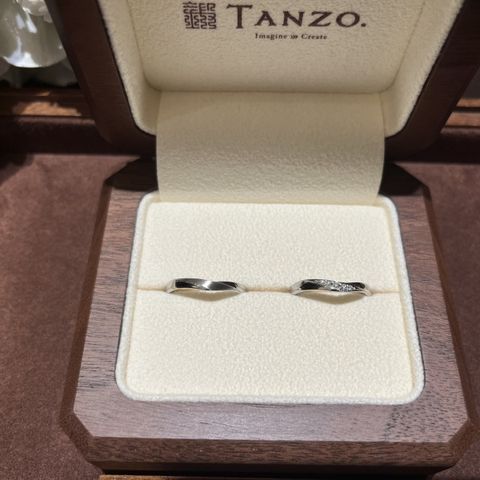 シンプルな中にも風を意識したデザインが組み込まれており、飽きがこないとても良い指輪です。 男性用の指輪は、中央部をヘアライン加工することで、デザインがよりくっきりしてよかったです。 女性用の指輪も、ダイヤが中央部に主張しすぎない程度に入っており、とても綺麗です。 指輪を入れておく桐箱もとても美しく品のあるものとなっています。