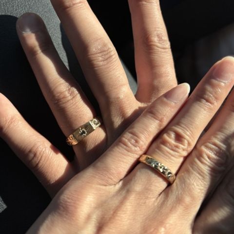 フルオーダーでオリジナルの自分たちだけの結婚指輪が作れるとSNSで見つけてここに決めました。 私たち夫婦の指輪は2人とも全く違うデザインにしたのですが、それぞれの思い出の地や縁起のいいものをモチーフにし最高の物ができました。