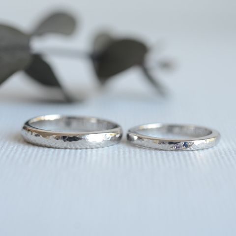 ベースのデザイン・素材は2人とも一緒にして表面の加工を半分ずつにしたり槌目加工をつけたりとそれぞれがこだわりました。また、石をつける部分は同じ位置ですが好きな色の石を入れたりとそれぞれの好きなデザインに決めました