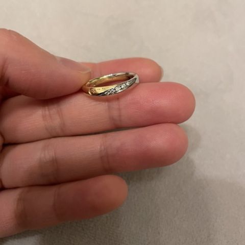 ひねりが入ったデザインにミル打ちとダイヤが目を惹きます。指輪自体も他の指輪より輝きが強めです。 他のひねりがあるデザインと比べると、真ん中ひねりのみならず、指輪の後ろの方まで深くくぼみが入っているのがお気に入りポイントでした。光の反射が強く、指につけていて何度も見てしまうほど好きなデザインです。