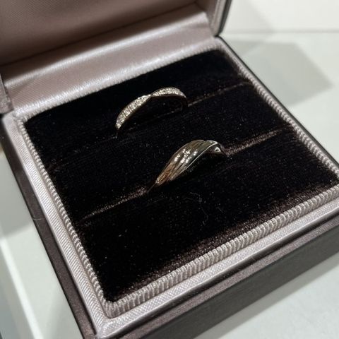 ウェーブラインにダイヤモンドが流れるように入ってる為、本当に綺麗 アルチェステは、お互いを思う心が鏡のように響き合い、ウェーブラインが向かいあってお互いを映す合わせ鏡を象徴しています。 指輪に込められた意味も素敵でお気に入りです。 私はアクセサリーを普段着けないので、デザインの次に着け心地をかなり重視していました。 その為、AIとスタッフの方が指の長さを測定してくれて、自分の手に合う指輪を探してもらえてとても良かったです。 私は水かきが深いタイプだったので、ウェーブがある指輪の方が着け心地が良いとのことでした。 同じく、彼も水かきが深いタイプだったのでせっかくなら同じデザインのものにしようとアルチェステにしました。 彼のは、ウェーブの部分にマット加工をしてあります。 マット加工すると一味違った指輪でかなりおしゃれです。